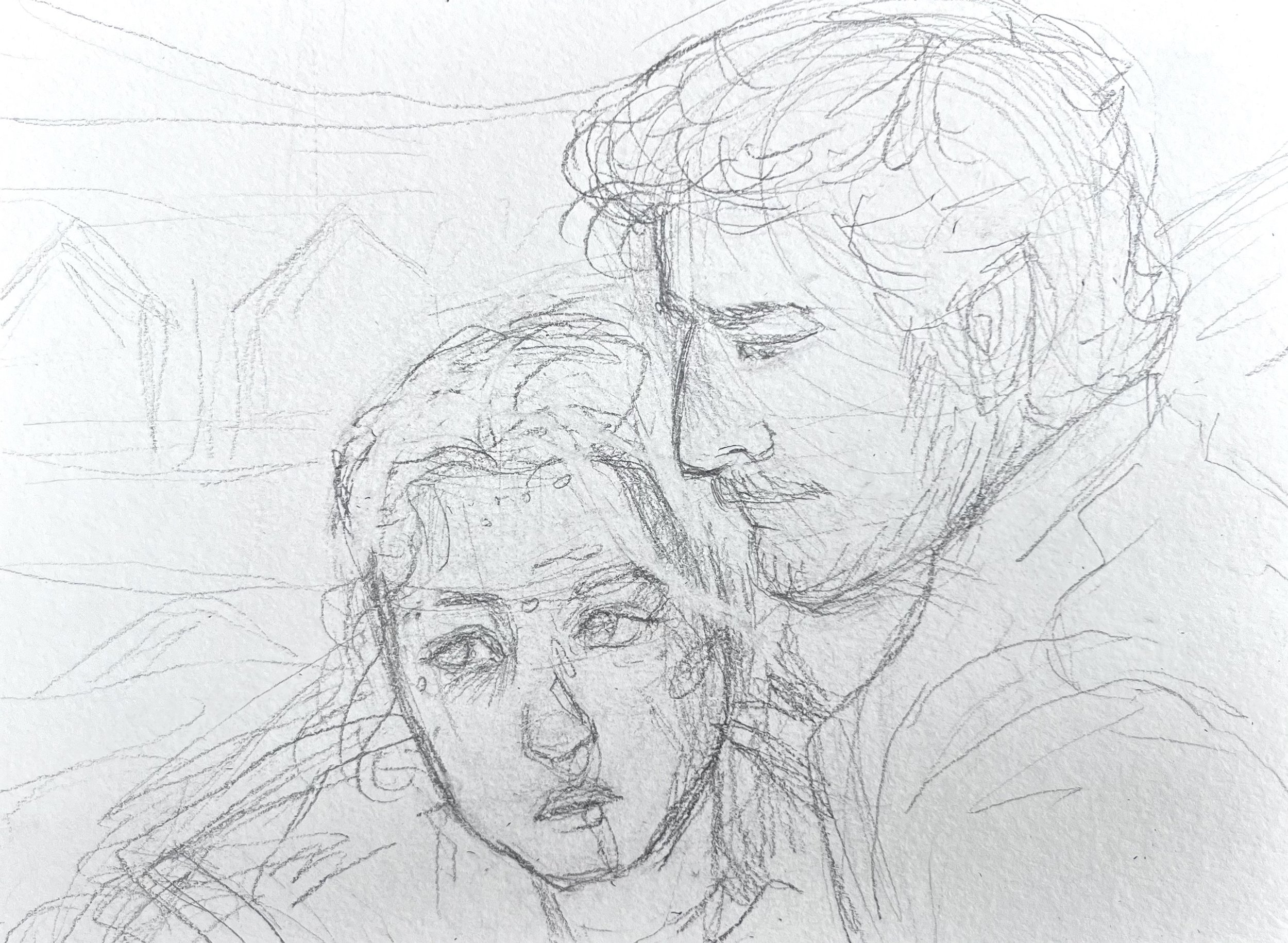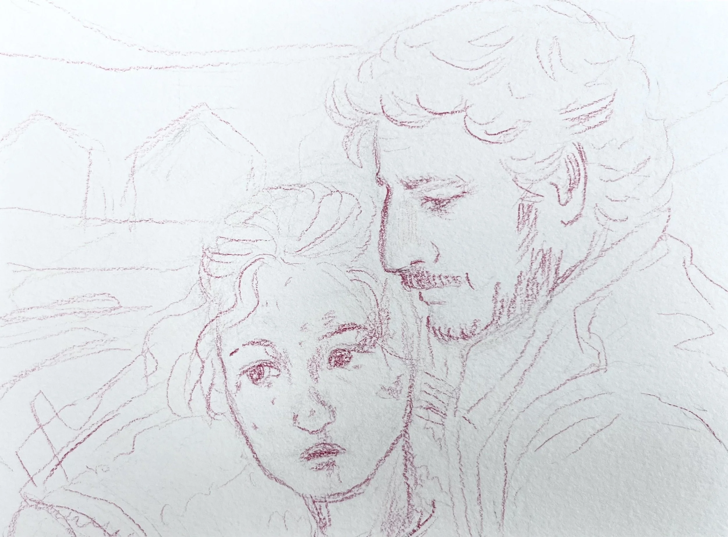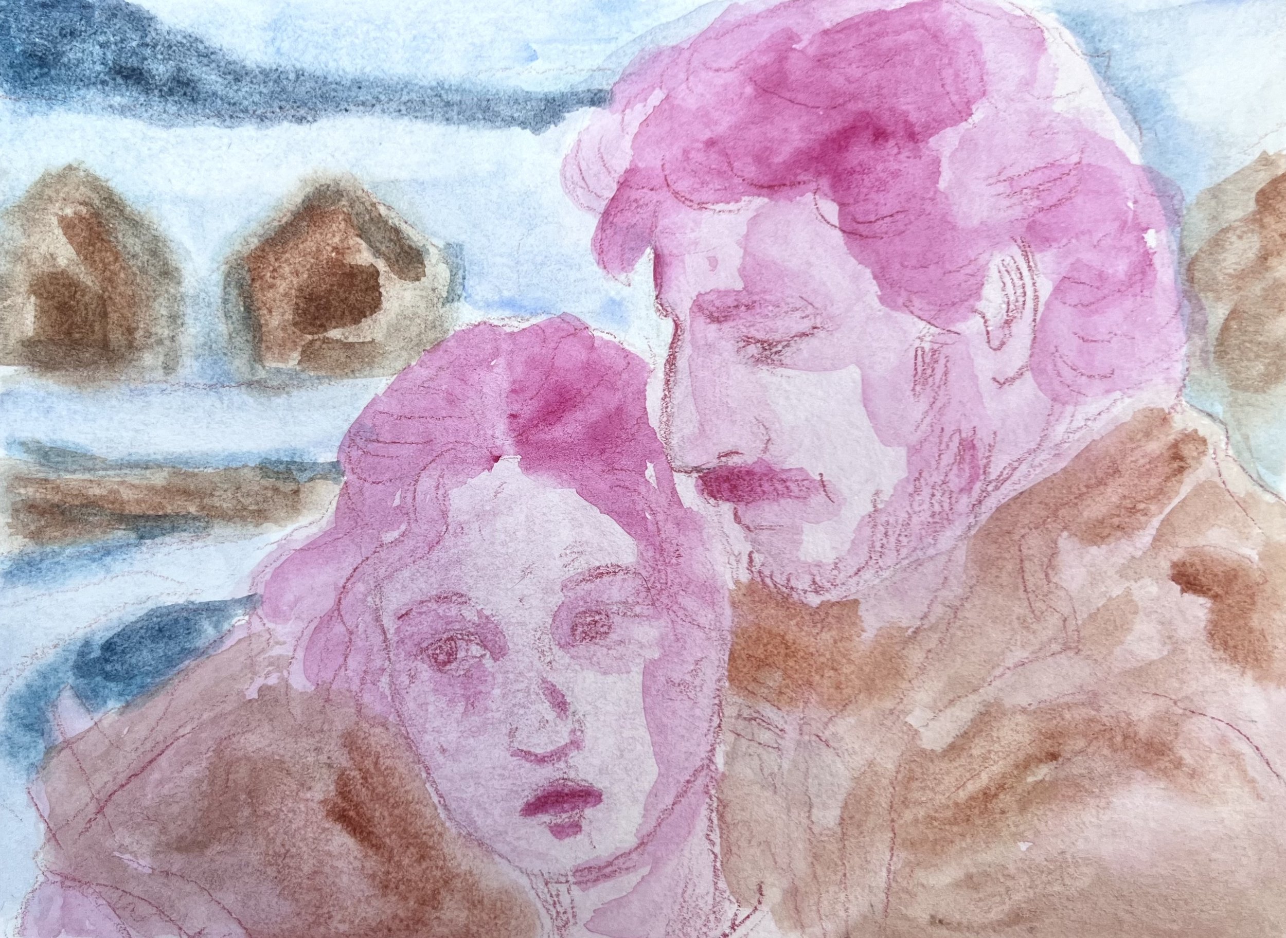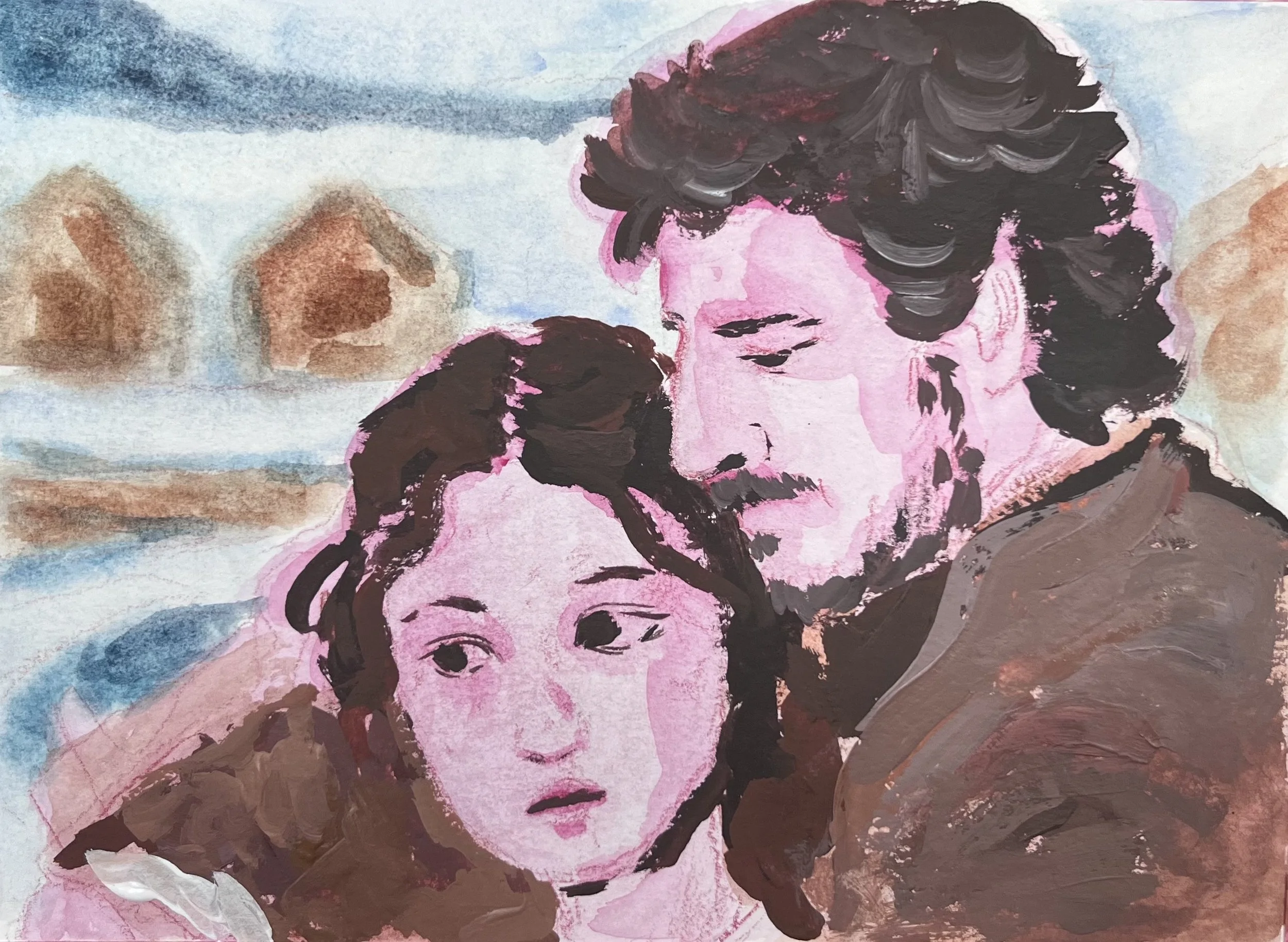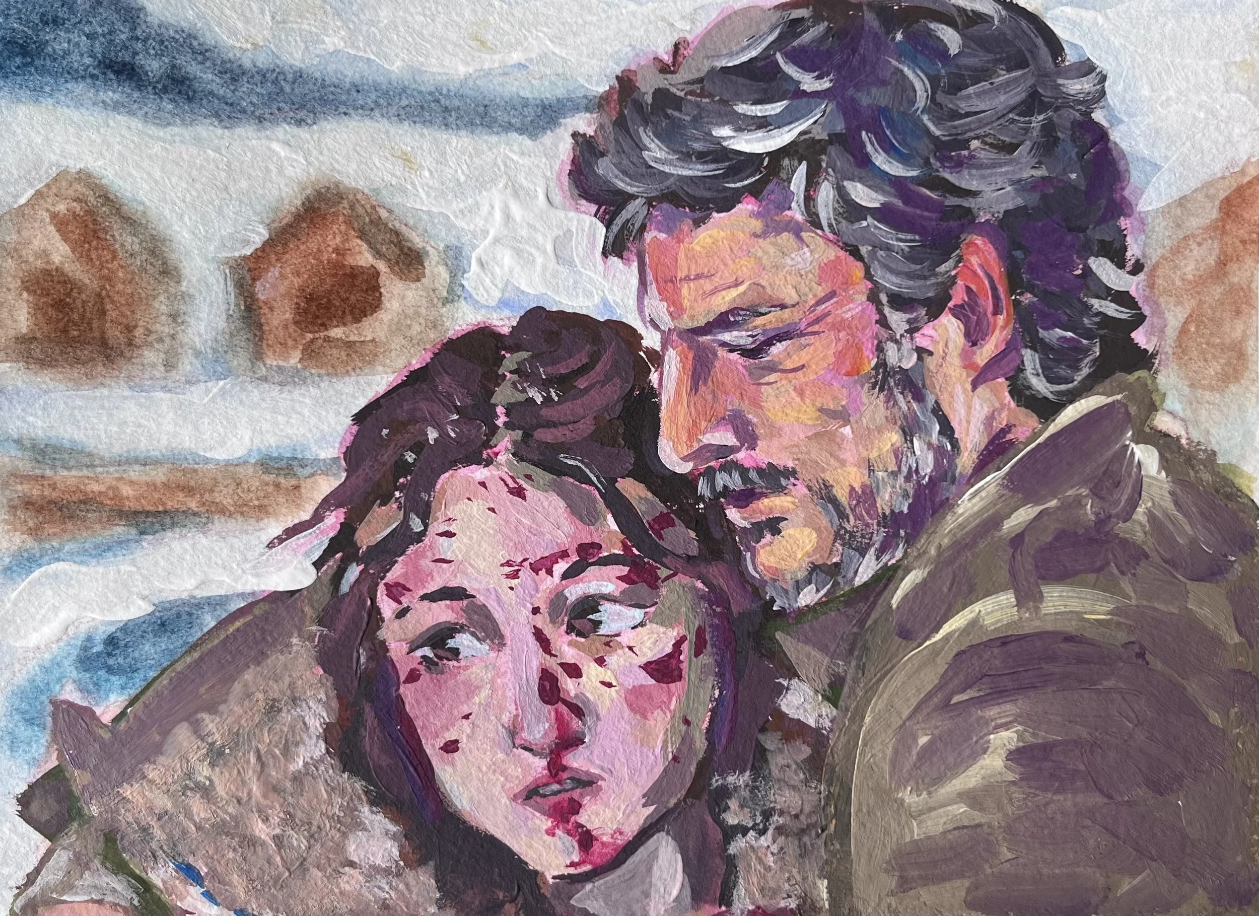 Watercolor and acrylic gouache painting of a scene from Episode 8 of The Last of Us. In this scene, Ellie just fought for her life. Once reunited, Joel comforts her and says, "It's OK, baby girl. I got you. I got you."