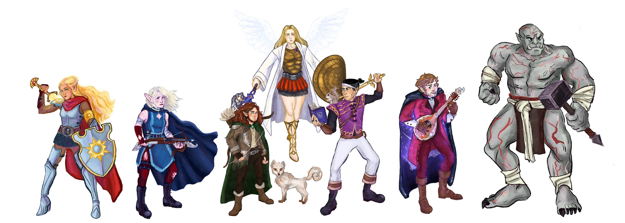 Digital character designs for a Dungeons and Dragons campaign group with seven members. Each character is based on detailed descriptions, background stories, and mood boards from each member.