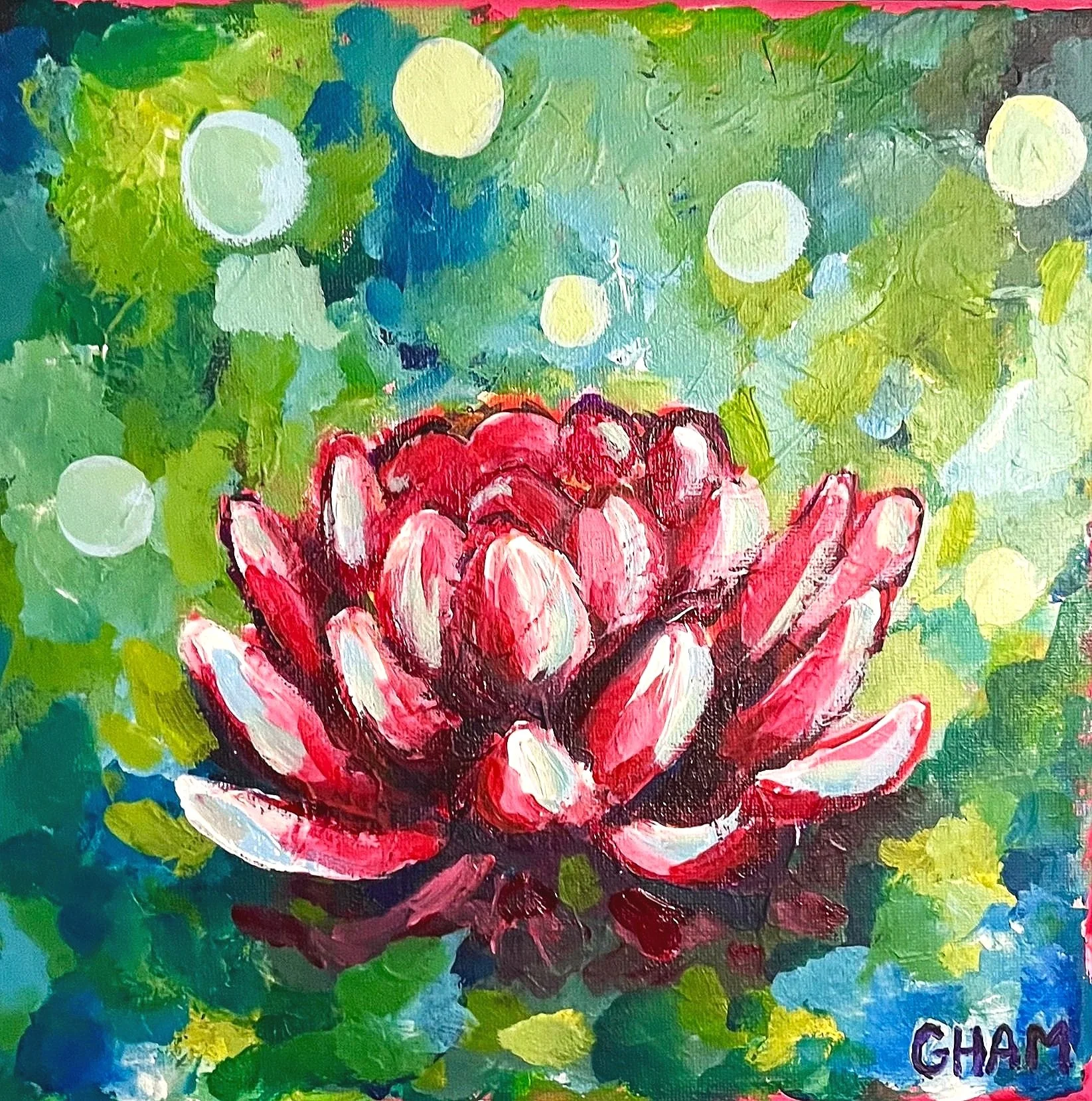 Acrylic painting on canvas of a vibrant lotus flower floating on water.