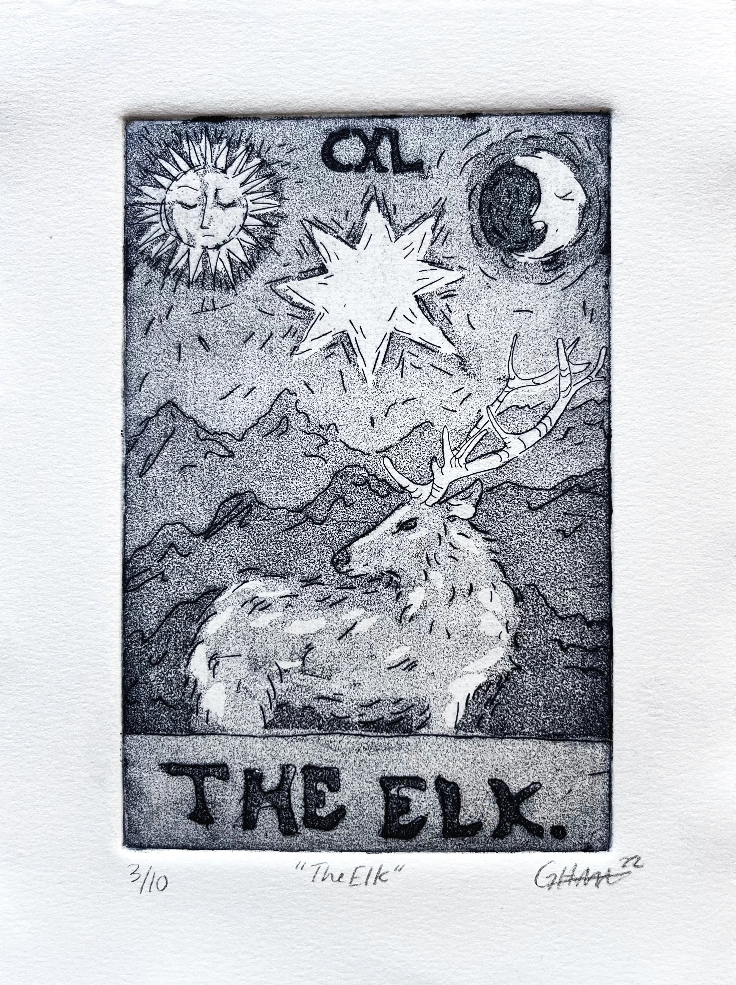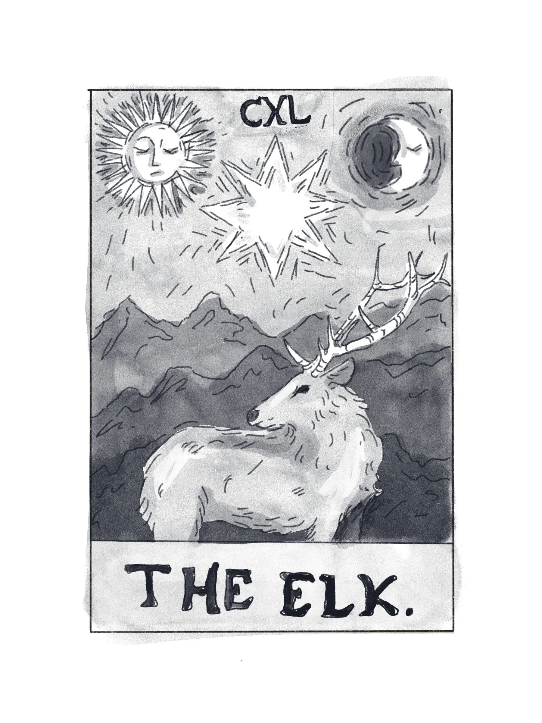 I designed my own tarot card, The Elk, to remind me I have strength for the journey ahead. Everyone is on their own unique path and there is joy in knowing the possibilities to come. The tarot card represents reflection, healing, and openness.