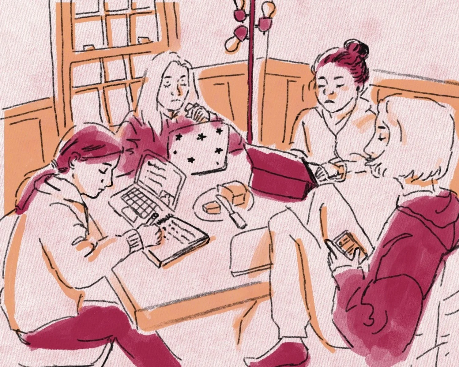 An observational drawing of my friends in our college house doing homework one night. Thank you Allie, Caroline, Julia, and Laura for letting me draw this moment.