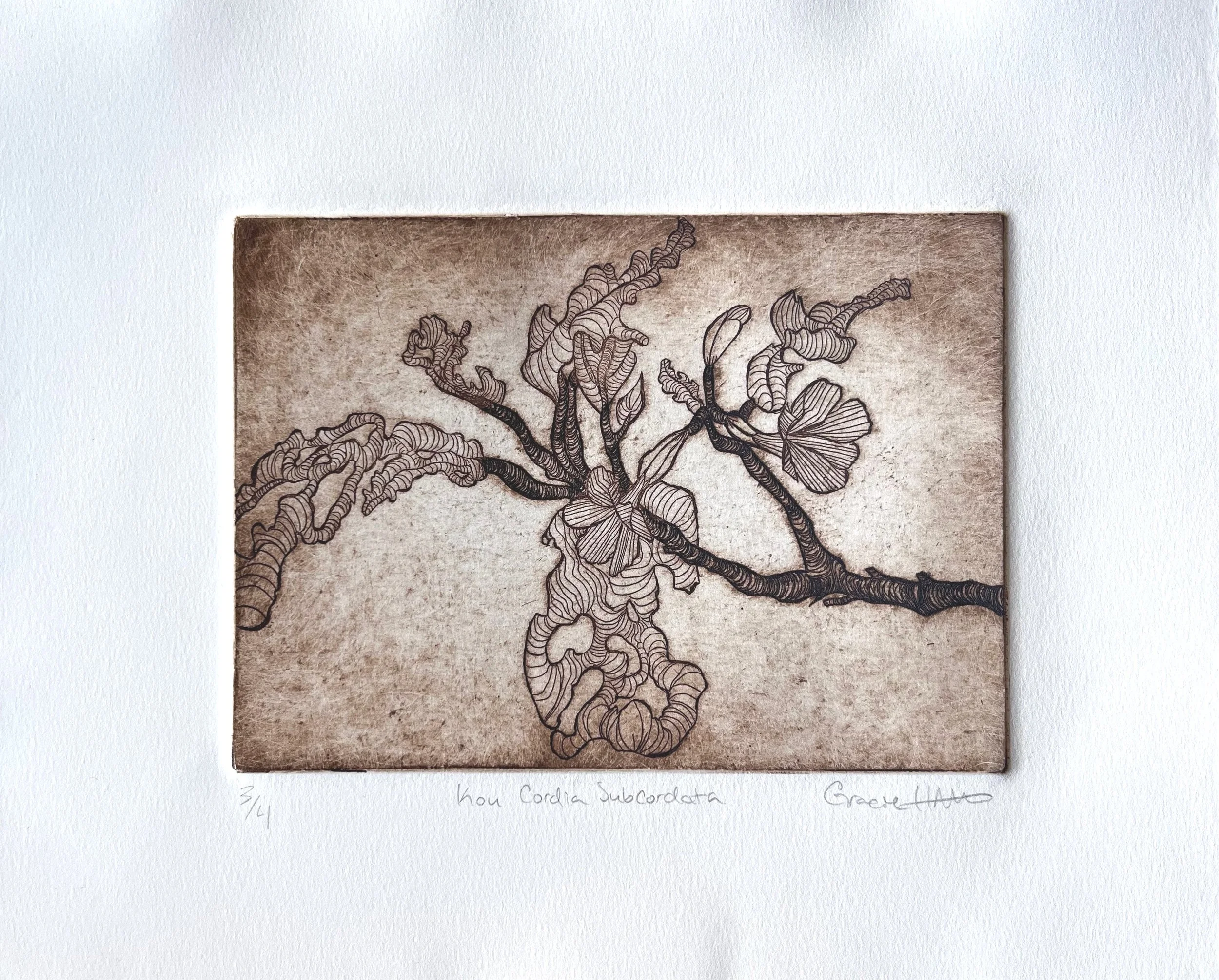 A couple years ago I traveled outside of the U.S. for the first time and had the opportunity to tour the Mayan ruins in Mexico. There were kou trees and they had these beautiful, bright orange flowers. I had never seen anything like it before. So, I felt the need to etch this beautiful tree from a photo I took while in Mexico.